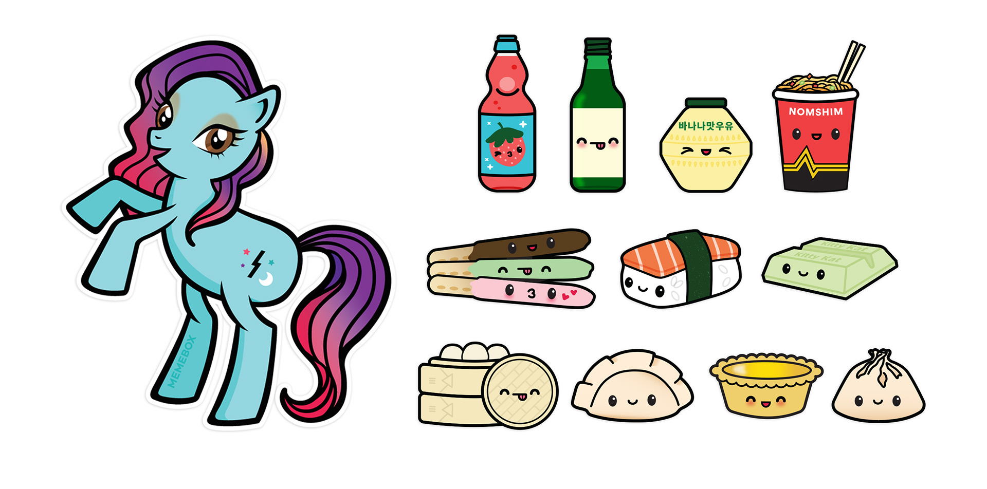 Illustrations for a sticker sheet gift with purchase. The My Little Pony character is a play off a collaboration with makeup artist "Pony" whose cosmetic line "Pony Effect" was sold through our platform.